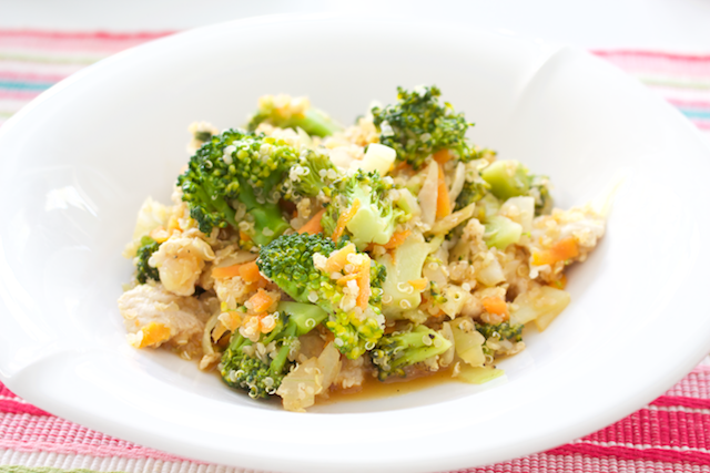 Idea on lainattu aasialaisesta fried rice -annoksesta. Riisi vain on korvattu kvinoalla ja öljyn määrä radikaalisti vähennetty.